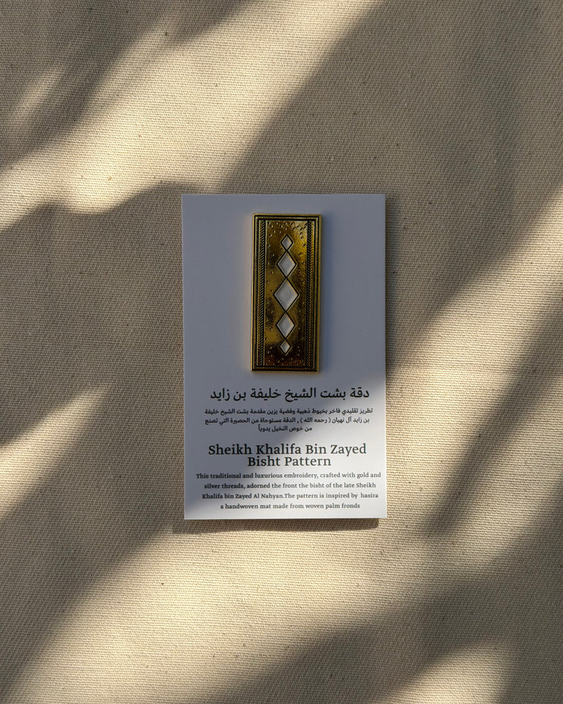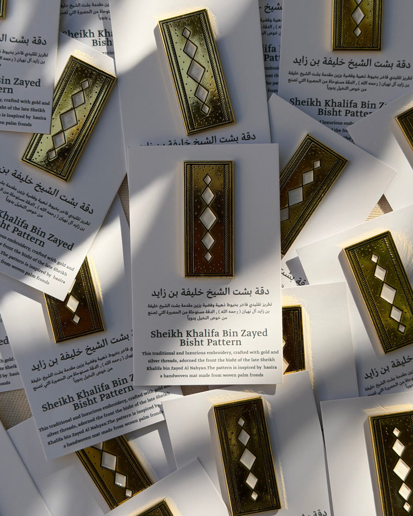 This traditional and luxurious embroidery, crafted with gold and silver threads, adorned the front the bisht of the late Sheikh Khalifa bin Zayed Al Nahyan.The pattern is inspired by hasira a handwoven mat made from woven palm fronds